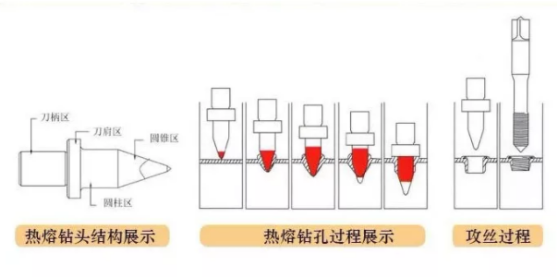 上圖很好的展示了熱熔鉆孔攻絲的整個(gè)加工過程,通過特殊處理過的熱熔鉆頭,在高速旋轉(zhuǎn)接觸到金屬材料表面的瞬間,會(huì)產(chǎn)生600℃-800℃的高溫,高溫軟化金屬的同時(shí),高速主軸帶動(dòng)熱熔鉆頭快速旋轉(zhuǎn)下壓,被擠壓的那部分金屬沿著圓孔朝上下延伸,形成比原金屬厚度三倍左右的厚壁層。熱熔鉆孔的整個(gè)加工過程不會(huì)破壞金屬材料的結(jié)構(gòu)和性能,同時(shí)形成的厚壁層具有抗扭力/拉力的性能,可以直接進(jìn)行高質(zhì)量的無屑攻絲。